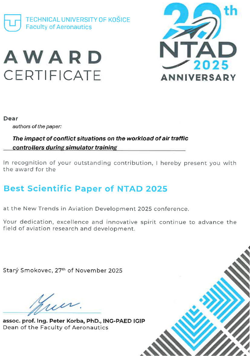 Příspěvek Katedry letectva s názvem „The Impact of Conflict Situations on the Workload of Air Traffic Controllers During Simulator Training“ získal ocenění nejlepšího vědeckého příspěvku v rámci jubilejního, 20. ročníku mezinárodní vědecké konference New Trends in Aviation Development (NTAD). Ta proběhla ve dnech 27. – 28. listopadu ve slovenském Starém Smokovci.